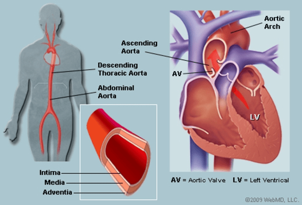 The heart pumps blood from the left ventricle into the aorta. Moreover aorta is an elastic organ that made it possible to stretch thus aid in maintaining the blood pressure. The aorta is the largest artery in the human body as well as the main artery in the circulatory system. The massive blue whale for example has an aortic artery that is large enough to nearly fit a human head inside.